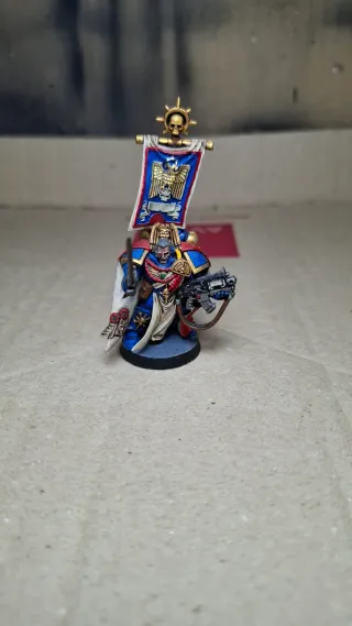 Modellino di Space Marine Capitano di Warhammer 40k, pronto per essere aggiunto alla tua collezione. - Dettagli accurati e pittura di alta qualità. - Include stendardo con aquila imperiale e teschio. - Arma da fuoco e spada inclusi.
