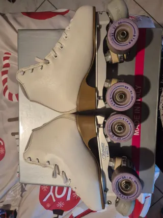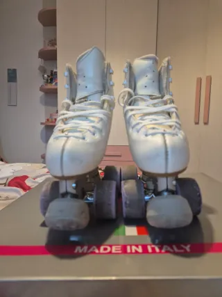 Pattini a rotelle Edea Esordio per bambina n. 220 (33) 2 anni di vita presentano piccole crepe sui lati degli scarpini e alcune usare all'interno. Per il resto sono in buonissimo stato. - Scarpetta bianca. - Chiusura con lacci. - Piastra Rodline Variant. - Ruote Star HD 70-55.