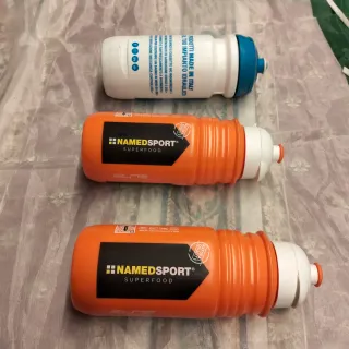 Set di tre borracce da ciclismo NAMEDSPORT Elite. - Borracce arancioni con logo NAMEDSPORT. - Una borraccia bianca con dettagli blu. - Ideali per ciclisti.