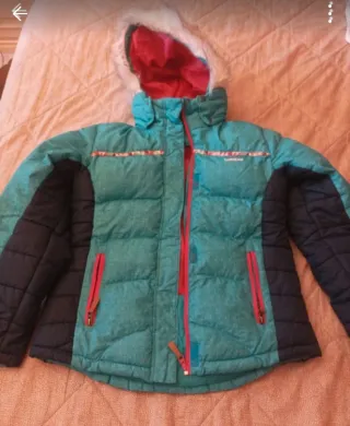 Tuta da sci completa per bambina, ideale per le giornate sulla neve. Presenta un design colorato e funzionale. - Colore principale: turchese. - Dettagli: zip e tasche rosse. - Cappuccio con pelliccia sintetica bianca. - Maniche e inserti laterali neri. Taglia 14 anni, 1.64cm