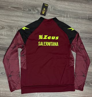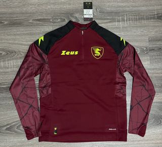 Felpa da allenamento della Salernitana per la stagione 2024/25. - Colore granata con dettagli neri e verdi fluo. - Maniche lunghe con stampa grafica. - Logo Zeus e stemma del club. - Zip corta sul collo.