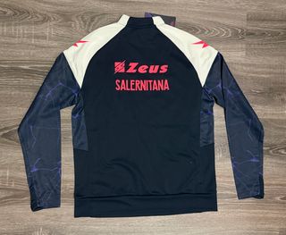 Felpa da training ufficiale Salernitana per la stagione 2024/2025, firmata Zeus. - Colore blu scuro con dettagli bianchi e rosa. - Maniche lunghe con stampa grafica. - Logo Zeus e stemma della Salernitana sul petto. - Zip corta sul collo.