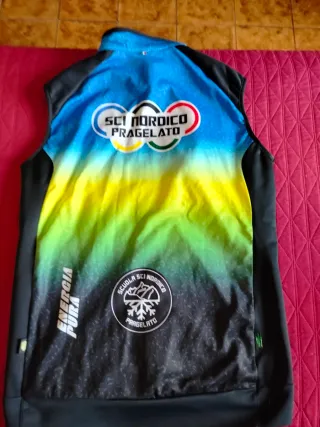 Gilet termico da sci nordico/ sci di fondo di Energiapura da uomo, modello groden fondo. Presenta una grafica sfumata dal blu al giallo e verde, con dettagli neri. - Zip frontale. - Tasche laterali con zip. - Collo alto.
