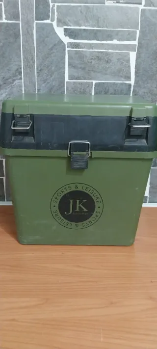 Cassetta verde per attrezzature da pesca con logo JK Sports & Leisure Jack Kirkham. - Chiusure a scatto in metallo. - Manico nero integrato.