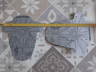 Set di due parafanghi per bicicletta con un design a tema alieno e desertico. - Grafica Cannondale in verde neon. - Illustrazione di un deserto con cactus, montagne e un UFO. Prezzo kit