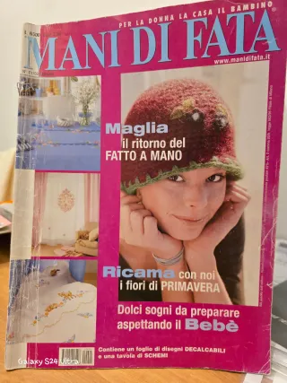 Rivista Mani di Fata dedicata al cucito, maglia e ricamo. Contiene progetti per la casa e per il bebè. - Maglia: il ritorno del fatto a mano. - Ricamo: i fiori di primavera. - Progetti per preparare l'arrivo del bebè. - Include un foglio di disegni decalcomani e una tavola di schemi.