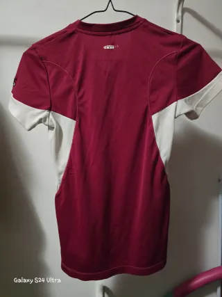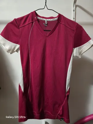 Maglietta tecnica Salewa da donna, ideale per attività sportive. - Colore bordeaux con inserti bianchi. - Scollo a V. - Maniche corte.