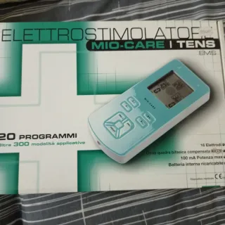 Elettrostimolatore per uso domestico, modello Mio-Care TENS EMS. - 20 programmi. - Oltre 300 modalità applicative. - Onda quadra bifasica compensata. - Potenza massima 100 mA. - Batteria interna ricaricabile. - Dispositivo medico.