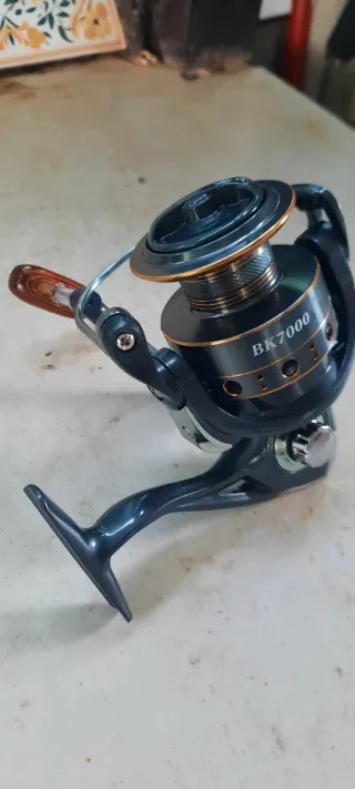 Mulinello da pesca Rooblinos modello BK 7000. Presenta una finitura scura con dettagli color bronzo leggero e maneggevole peso gr 300 circa ottima capacità di carico bobina in lega mai usato ancora in confezione originale - Manovella con impugnatura in legno. - Design moderno.