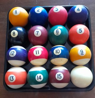 Set di 15 palle da biliardo per carambola. - Marca: Aramith - Diametro: 57,2 mm - Numerazione da 1 a 15 in buone condizioni con vassoio nuovo del valore di 10 € compreso altri tipi e diametri per boccette goriziana italiana super aramith nelle altre mie inserzioni