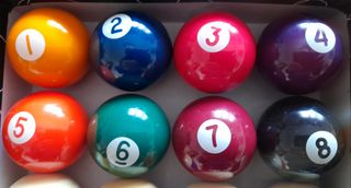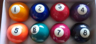 Set di palle da biliardo professionali Aramith. - Diametro: 61,5 mm - Colore: 1 palla blu, 4 palle rosse, 4 palle bianche in perfette condizioni scatola senza coperchio altri tipi e diametri per boccette goriziana italiana carambola aramith nuove e usate negli altri miei annunci