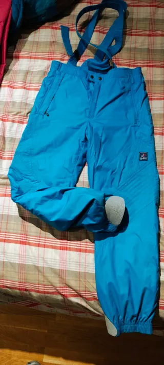 Comodi e caldi, con bretelle, hanno una cerniera laterale utile quando fa più caldo, in buone condizioni, solo due piccoli taglietti in fondo con le lamine degli sci
