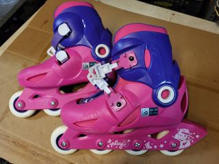 Vendo un paio di pattini in linea Play3, rosa e viola, taglia 32-34 (20-21,5). Sono in buone condizioni. Complete di protezioni per mani, gomiti e ginocchia, taglia XXS (<25 kg). Aggiungo anche il caschetto. - Marca: Oxelo (Decathlon) - Colore: Rosa e viola - Taglia: 32-34 (corrispondente a 20-21,5)