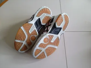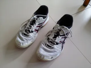 Scarpe da pallavolo Asics Gel Rocket. - Taglia 44. - Design bianco e nero con dettagli rossi. - Logo Asics sul lato. Scarpe utilizzate parecchie volte. Ideal per pricipianti.