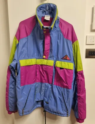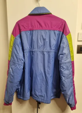 Giacca da neve Aesse da uomo, taglia S. Un capo colorato e vivace, perfetto per le giornate sulla neve. - Design a blocchi di colore con pannelli blu, fucsia e verde lime. - Collo alto con chiusura a bottoni. - Tasche frontali con patta. - Tasche frontali con cerniera - Tasca interna - Prese d'aria sotto braccia con zip - Logo Aesse sul petto. - In ottimo stato