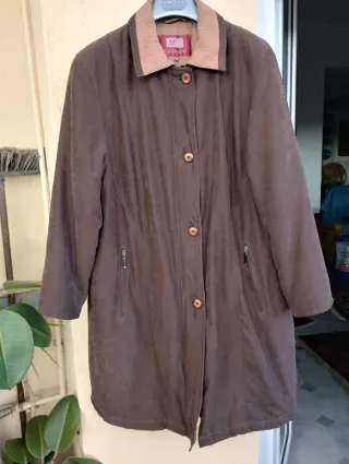 Giaccone lungo di colore marrone Dimensioni nell' ultima foto - Taglia 50. - Collo in tessuto a contrasto. - Chiusura con bottoni e cerniera - Tasche laterali con zip.