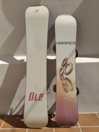 Due tavole da snowboard dei marchi Olé e Hammer, lunghe rispettivamente 156 e 143, con le loro cinture. Gli scarponi sono Quechua, numero 46 e 39. Ottime condizioni e poco usati, specialmente gli scarponi (2 volte).