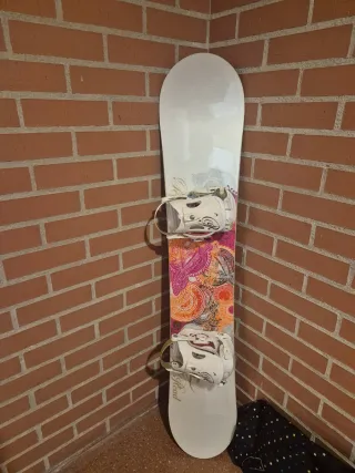 -Tavola da snowboard GNU con un design floreale e geometrico in bianco e nero. Sistema banana e magnetraction. Taglia 147 cm. -Fissaggi marca Switchback. -Scarponi marca Thirtytwo (taglia 41 ma la marca taglia grande, sarebbe una taglia in meno).