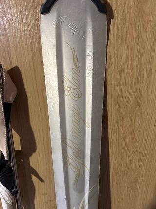 Set completo di sci ELAN per godersi la neve. - Sci dorati. - Sci dorati con design floreale. - Due bastoni da sci. - Scarponi da sci GRIS BLANCO TERCIOPELO marca TECNICA.