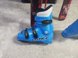 Scarponi sci infantili marca Lange, in colore blu. Taglia 22,5 (circa 35). Sci Atomic 120 cm con attacchi. Bastoncini.