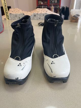 Scarponi da sci di fondo marca Fischer. Colore bianco e nero. Chiusura con cerniera frontale. Molto caldi. Design sportivo.