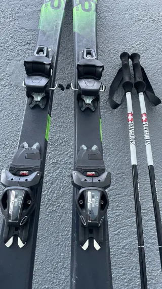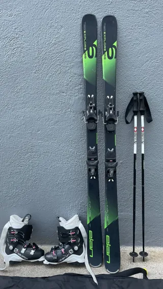 Set completo di sci per godersi la montagna. Include sci, scarponi e bastoncini. - Sci Elan Explore 168. - Scarponi da sci Salomon taglia 25. - Bastoncini da sci.