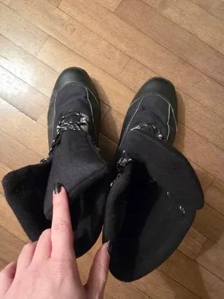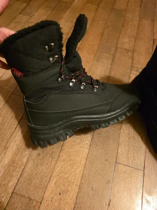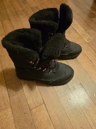 Scarponi invernali Decathlon, perfetti per tenerti al caldo. - Colore nero con dettagli rossi. - Interno foderato in pelliccia sintetica.