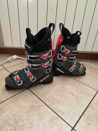 Scarponi da sci marca Nordica, modello 2024. 27.5 - Colore grigio e rosso. - Chiusura con ganci. - Logo Nordica visibile.