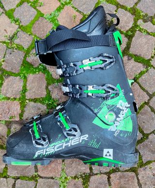 Scarponi da sci Fischer per donna. Colore nero. Interno foderato in tessuto morbido. Chiusure a leva. Mostrano segni d’usura come mostrato in foto, ma sono ancora in ottime condizioni. tg. 25.5 (39)