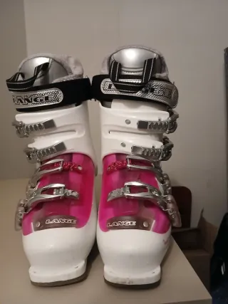 Scarponi da sci Lange bianchi con disegni rosa. - Chiusura con ganci. - Interno foderato in tessuto grigio. - usati pochissimo Taglia indicata sullo scarpone 24,5