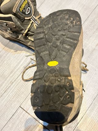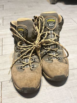Scarponi da trekking marca Asolo, taglia 40.5. - Colore beige e grigio. - Materiale scamosciato e tessuto. - Lacci bicolore. - Logo Asolo sulla linguetta.