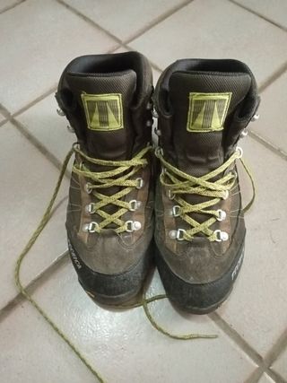 Scarponi da trekking Tecnica Makalu, usati ma in buone condizioni. Ideali per escursioni. - Modello Makalu - Colore marrone e verde - Lacci gialli