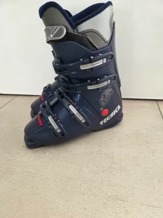 Scarponi da sci Tecnica unisex, adatti a taglie 38-40. Da cambiare il tacchetto - Colore blu scuro. - Chiusura con ganci. - Logo Tecnica sul cinturino.