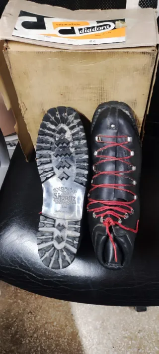 Scarponi da sci vintage Diadora modello Shoritz. - Tomaia in pelle nera. - Lacci rossi. - Suola in gomma con carrarmato. - Taglia 44.