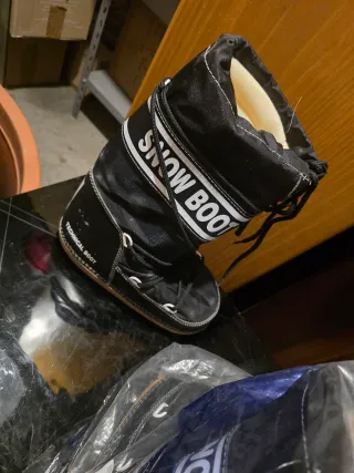 Scarponi da neve neri, ideali per affrontare il freddo e la neve con stile. Usati due volte. - Design imbottito. - Laccio di chiusura. - Logo a contrasto sulla fascia.
