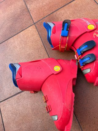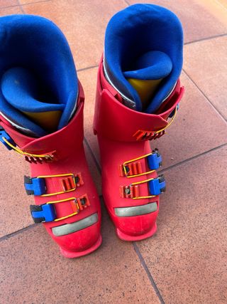 Stivali da sci di colore rosso brillante con dettagli in blu e giallo. Progettati per offrire comfort e vestibilità. - Chiusura con fibbie. - Interno imbottito. 271mm