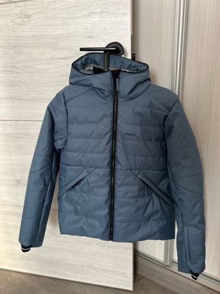 Giacchetta da sci e neve imbottita e impermeabile Wedze 100 con cappuccio per bambina, ideale per godersi la montagna. Usata una sola volta. - Taglia 12 anni. - Chiusura con cerniera. - Design imbottito. - Colore blu tempesta. - Cappuccio integrato. - Tasche laterali con cerniera e tasca sulla manica. - Fondo interno con gomma regolabile, per proteggere dal freddo. Ideale per la neve ma comoda anche per giornate fredde e piovose.
