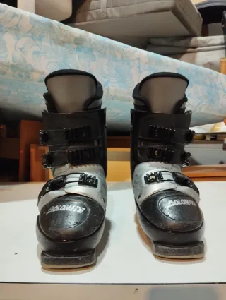 Stivali da sci del marchio Salomon. Chiusura con fibbie. Design in bianco e nero. Dettaglio arancione all'interno.