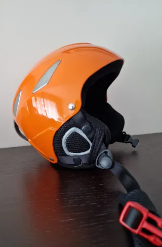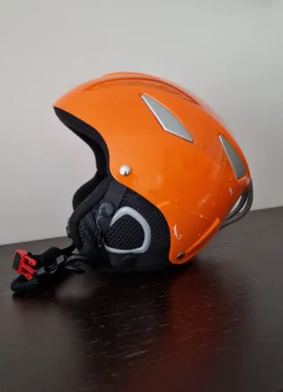 Casco da sci di colore arancione brillante, progettato per proteggere durante la pratica di sport invernali. - Esterno liscio e brillante. - Imbottitura interna nera. - Sistema di regolazione con cinturino e fibbia.