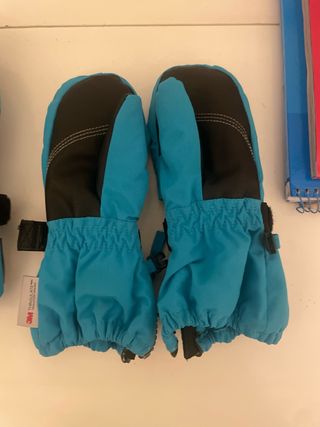 Due paia di guanti da sci per bambini del marchio Unigear (taglie 2-4 anni e 4-6 anni). Sono di colore turchese e presentano chiusura in velcro e cerniera.
