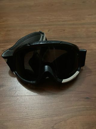 Set di guanti da sci e occhiali protettivi. - Guanti neri con dettagli grigi e bianchi. - Occhiali con lente arancione e cinturino regolabile. 5€ ciascuno. Taglia 7-10 anni.
