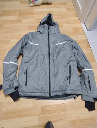 Giubbotto da sci grigio con dettagli riflettenti. - Chiusura con cerniera frontale. - Due tasche con cerniera nella parte anteriore. - Polsini regolabili. - Cappuccio integrato.