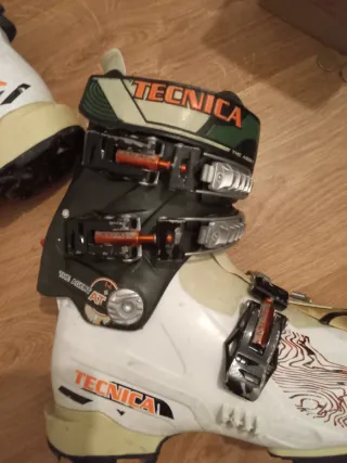 Stivali da sci da sci di fondo della marca Tecnica. Progettati per offrire prestazioni e comfort in montagna. Colore bianco e nero con dettagli arancioni. Chiusure con fibbia regolabili. Design ergonomico. Per fissazione antica. Hanno anni e l'usura visibile nelle foto ma senza parti rotte. Taglia 26.0/26.5, 298 mm, suola Vibram.
