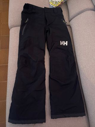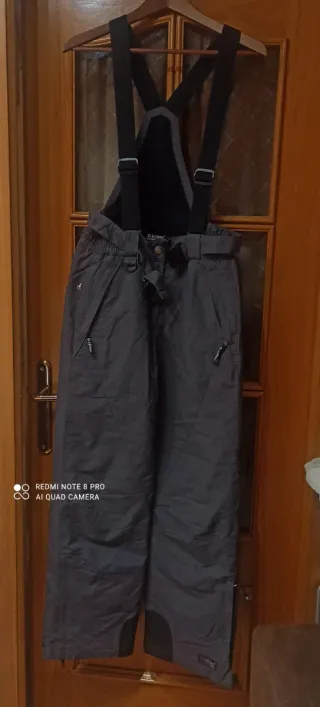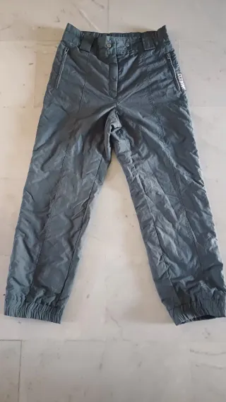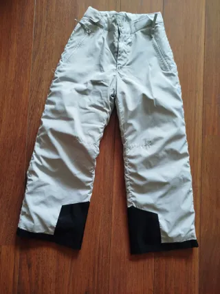 Pantaloncini da sci per bambini, taglia 7-8 anni. Ideali per godersi la neve in comodità. Colore grigio chiaro con dettagli neri sul fondo. Cintura regolabile. Tasche laterali.