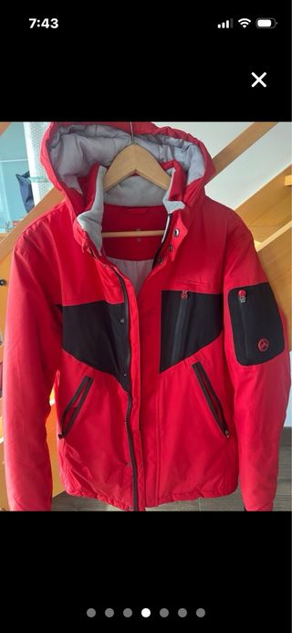 Giubbotto tecnico per la neve. Marca TIjuana. El Corte Inglés. Colore rosso con dettagli neri. Chiusura con cerniera frontale. Tasche con cerniera. Cappuccio regolabile. Polsini e fondo regolabili. Impermeabile.