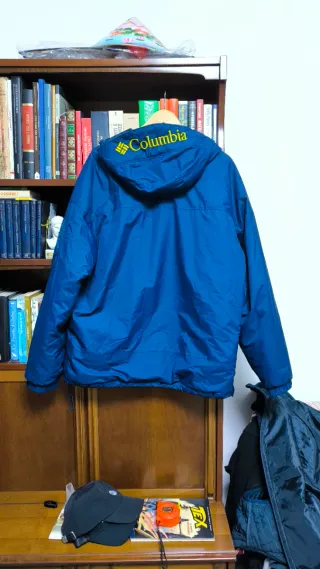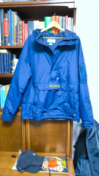 Guscio Columbia blu con cappuccio e tasca frontale. - Logo Columbia ricamato. - Zip frontale parziale. - Tasca a marsupio. - Zip laterale sulla manica. - Coulisse sul fondo.