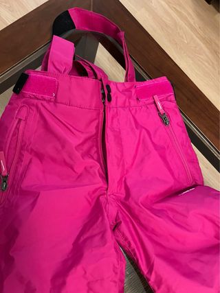 Set neve Decathlon in colore rosa, ideale per godersi la montagna. - Giacca e pantalone abbinati. - Design imbottito nella zona del busto della giacca. - Cerniere di colore blu. - Marca: Decathlon.