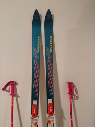 Set di sci Volkl con bastoncini. - Sci da discesa. - Bastoncini da sci. - Design blu e rosa.