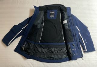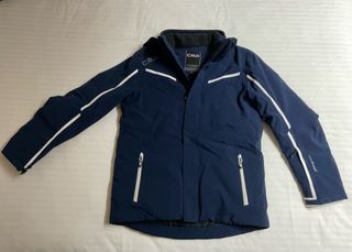 Giacca da montagna per bambini, ideale per le giornate fredde. - Colore blu con inserti neri e strisce bianche. - Taglia indicata per 6/8 anni. - Chiusura con zip frontale. - Cappuccio integrato.