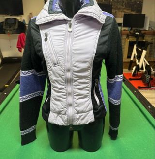 Giacca da sci da donna con un design moderno e funzionale. Perfetta per le giornate sulla neve. - Inserti trapuntati sul davanti. - Maniche in tessuto tecnico nero. - Dettagli a contrasto blu e viola. - Zip frontale e tasche con zip. Misura 40 cm da spalla a spalla ed è lunga 57 cm. Ottimo stato.